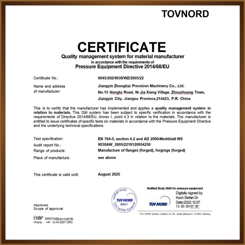 江陰眾海精密機械有限公司生產法蘭多年,我們采用先進、高效、 成熟的生產管理模式。我們的主要產品有盲板法蘭、板式法蘭、承插 焊法蘭、搭接法蘭、帶頸對焊法蘭等。公司產品符合國標、 美標、 日標、歐標等生產標準,并取得 ISO9001,特種設備生產許可證-壓力 管道原件制造,歐盟承壓設備指令認證等各類資質證書。我們可提供 不銹鋼、碳鋼等材料的法蘭。…